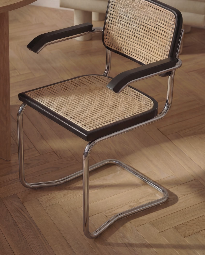 Unser Freischwinger SKØR – eine elegante Verbindung aus zeitlosem Design, architektonischer Klarheit und traditioneller Handwerkskunst. Die Sitz- und Rückenfläche aus handgefertigtem Wiener Geflecht Made in Italy verleiht dem Stuhl eine außergewöhnlich leichte, luftige Ausstrahlung und macht ihn zu einem stilvollen Statement am Esstisch.